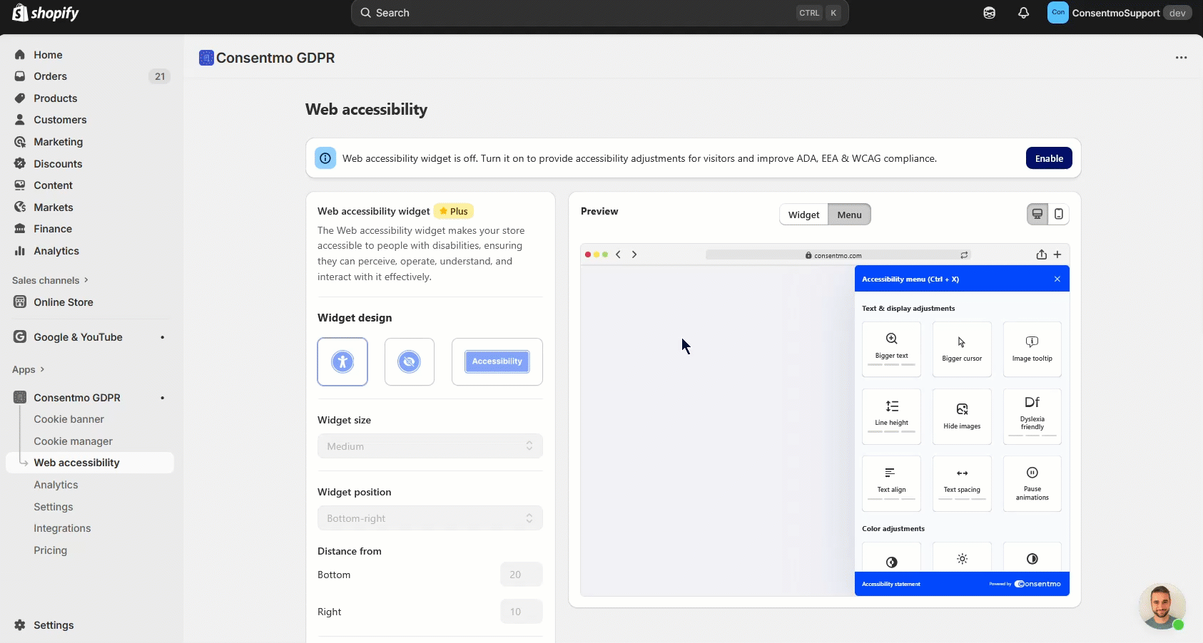 From the app dashboard, under Consentmo GDPR → Web Accessibility, you can: