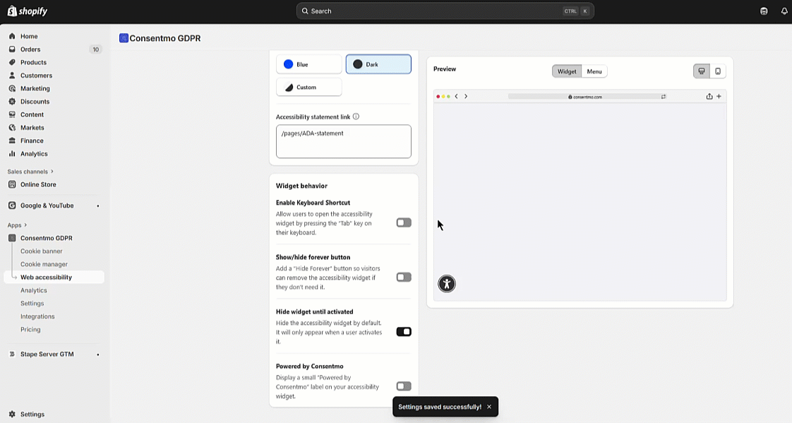 Our team is here for you! If you’d like assistance enabling the widget or aligning it with your theme design, feel free to reach out via live chat in the app or email us at support@consentmo.com
